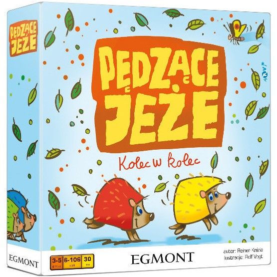 Pędzące jeże : kolec w kolec / autor Reiner Knizia ; ilustracje Rolf Arvi Vogt. - Warszawa : Egmont, copyright 2014. - 1 gra (plansza, 4 figurki jeży, 55 kart, 36 żetony punktów) : drewno, karton, kolor ; w pudełku 5x20x20 cm + instrukcja (ilustracje ; 19 cm).